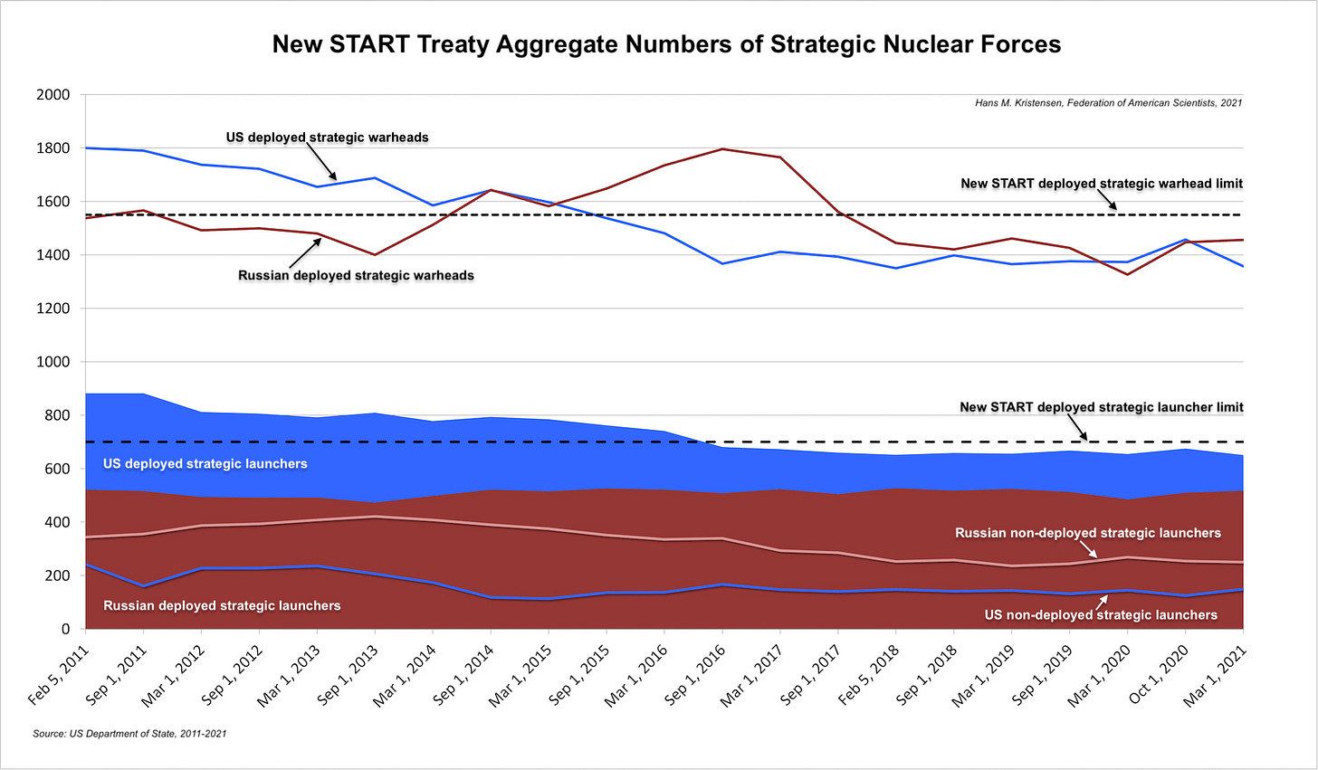 New START reduced the U.S. nuclear stockpile by ~1300 warheads, while Russia’s nuclear arsenal declined by nearly 1000 warheads. Following the expiration of the START I treaty in December 2009, New START entered into force on February 5, 2011. It was in place until February 3, 2021, when both sides agreed to its optional five-year extension until February 5, 2026. New START remains the only nuclear arms agreement between the U.S. and Russia, and it has recently been strained.