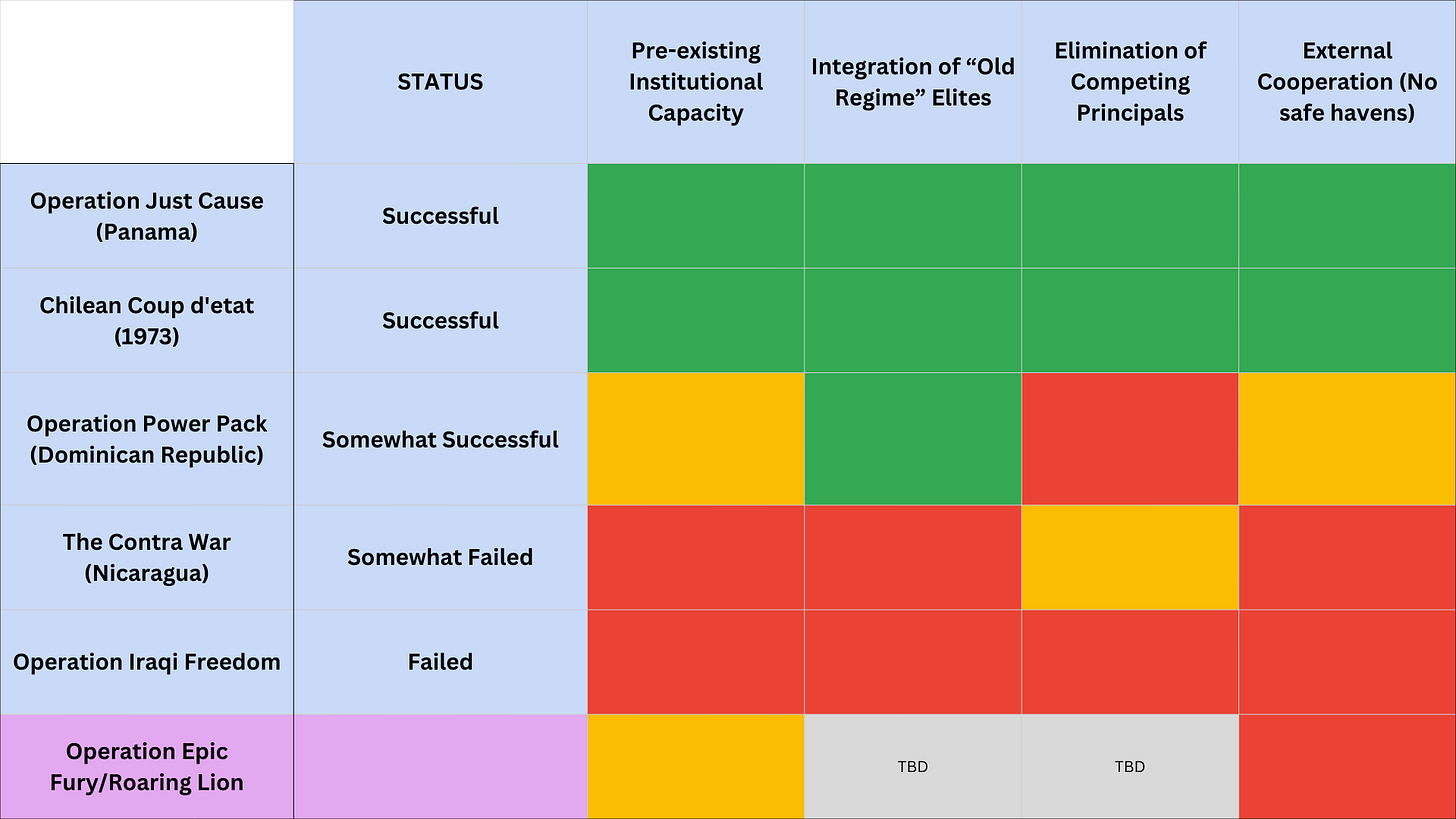 In my mind, the most pressing issue is that there is no clear U.S.-backed successor like Guillermo Endara in the Panama case. The time to capitalize upon Operation Epic Fury is now, but there doesn’t seem to be much institutional momentum. This is partly because of fear of IRGC retaliation and partly because there lacks a cohesive movement or rally around someone that could take Khamenei’s place. With the transition council already in talks to replace top leadership, their window of opportunity will quickly close, especially as the IRGC forces regroup from the initial waves of attack. The Pentagon is highly unlikely to put boots on the ground, and the U.S. has never toppled a regime purely by air support.